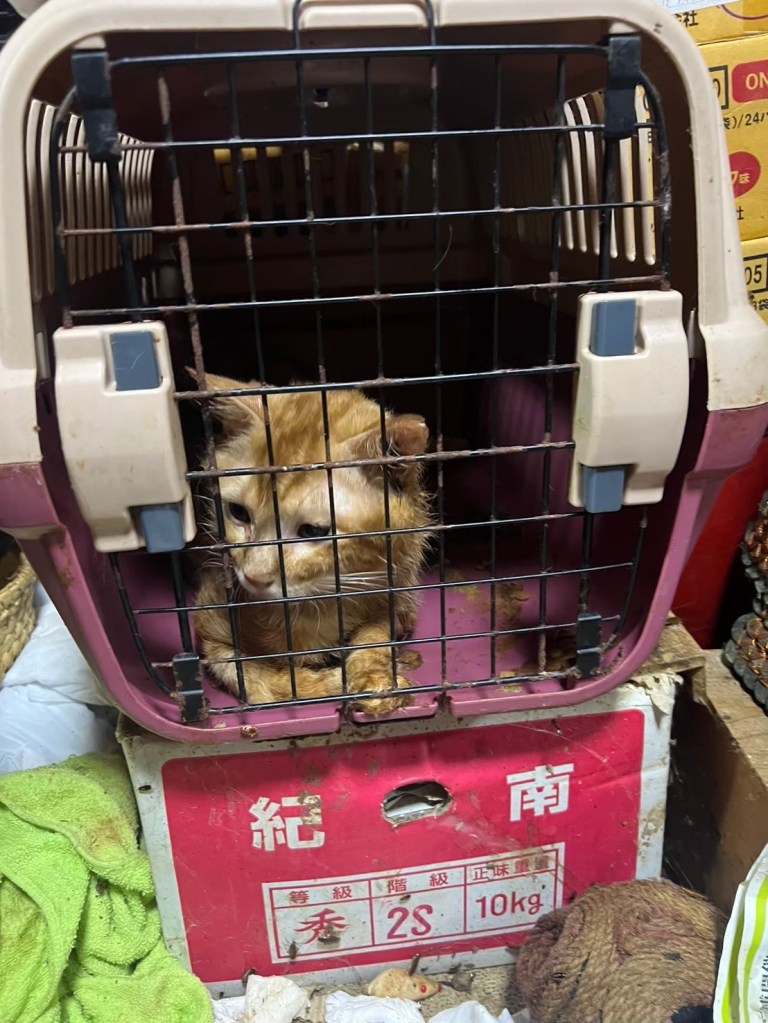 1匹だけキャリーに閉じ込められている猫さんがおり、福祉職員の方によると数年にわたってキャリー内で飼育されているとのことで、取り急ぎこの子を保護しました。