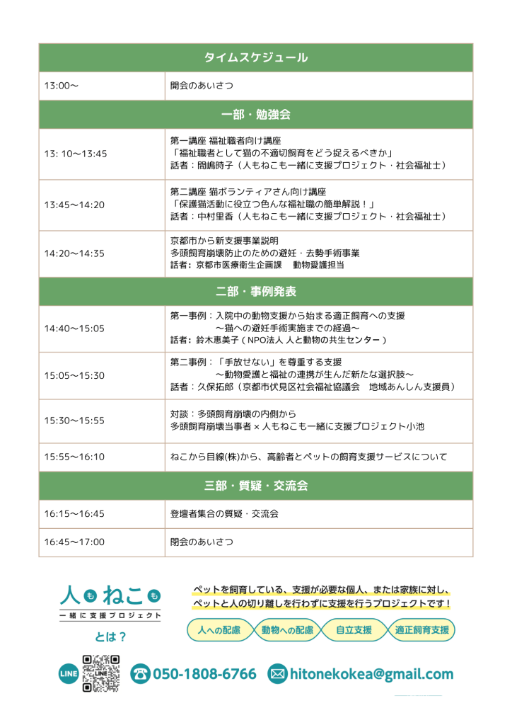 人もねこも一緒に支援プロジェクトからは、講師を務める中村・間嶋のNSWコンビだけでなく、研究チームのメンバーや、代表の小池も参加します。一緒に、前向きな議論をしましょう!!!