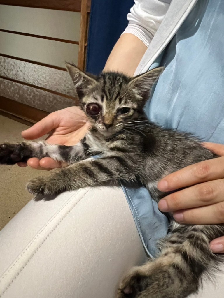 生後2ヵ月程度の子猫が3匹居ましたが、ひどい猫風邪をひいており、両目がつぶれてしまっている子、片目が飛び出してしまっている子と、どの子も危険な状態でした。