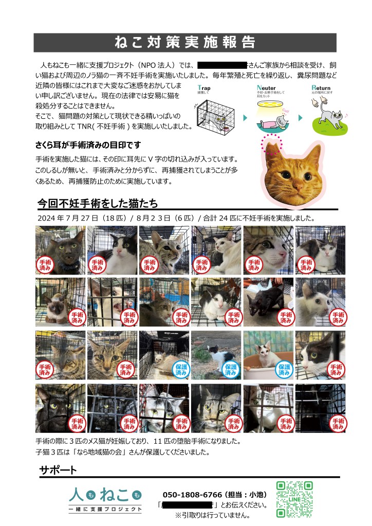 全頭に手術、ワクチン、ノミダニ駆除を実施していただき、手術翌日に14匹を飼い主さん宅へリターンしました。