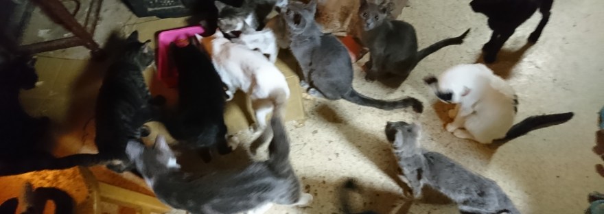猫密度の高さに驚きますが、ご飯が用意されるのを大人しく待ち、食べているときも一定の秩序があることにまた驚きました。